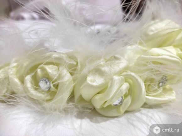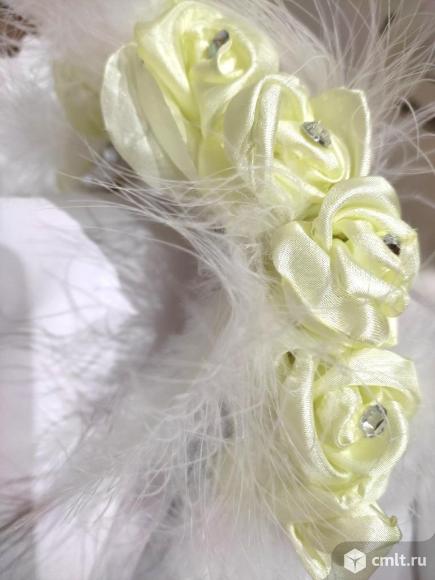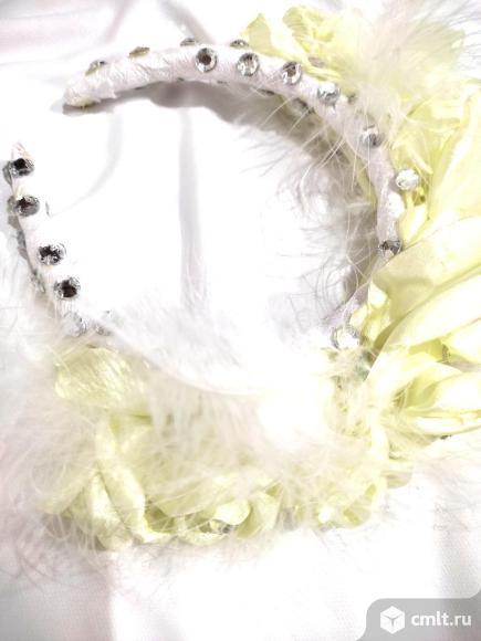 Новый ручной работы Ободок, выполнен из белого бархата, лимонно-желтых Шёлковых Роз, Страз и перьев Марабу в комплекте невидимка с белым шифоновый цветком ,украшена бусинами, Перламутровыми Кабашонами и Перьями