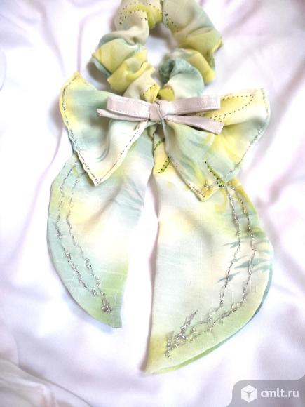 Новый ручной работы шифоновый бантик канарско-зеленого и бледно-лаймового цвета, вышит серебряными нитями, длина 22 см