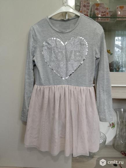 Очень хорошее Платье детское трикотажное с рукавами, лёгкое, мягкое, верх серый с блестящим серебряным "сердцем", низ розовый, подьюбник двойной, трикотадный, сверху сетчатый двойной, р.140-146 в отличном состоянии, дешево -100 руб
