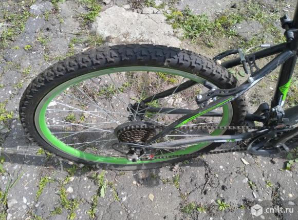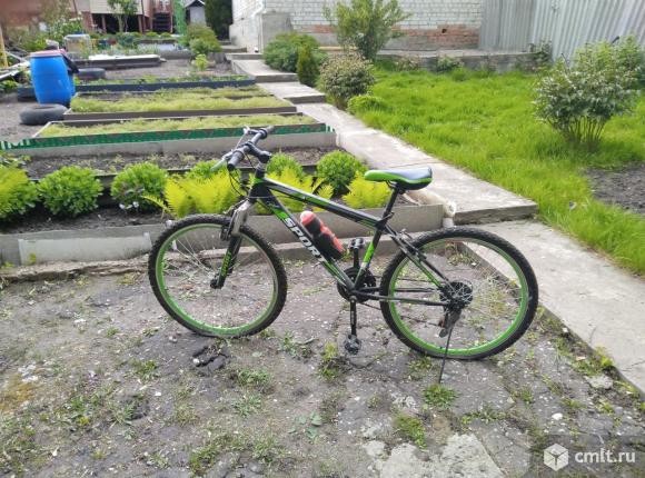 Велосипед спортивный, салатового цвета на под рамнике крепление для фляжки имеет подставную ножку.