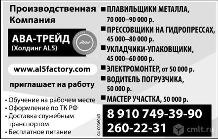 Оплата 50 тыс. р. Обучение на рабочем месте. Оформление по ТК РФ. Доставка служебным транспортом. Бесплатное питание. Производственная компания АВА-Трейд (Холдинг AL5).