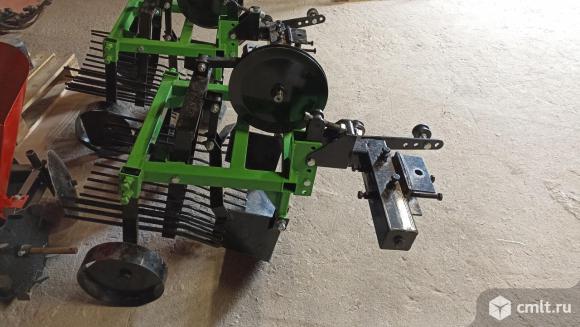 Картофелекопалка вибрационная (грохотного типа) агрегатируется к мини-тракторам с трехточечным типом подвеса и мощностью от 20 л.с. Активными yзлами данного агрегата являются нож и грохоты. Грохотную копалку можно применять не только для уборки картофеля, но также и других корнеплодов, близких с картофелем в размерах – лука, крупного чеснока, свеклы. За один проход оборудование выкапывает один ряд корнеплодов. Ширина захвата в 40 см обеспечивает максимальный захват клубней даже из-под кустов, имеющих разветвленную корневую систему.
