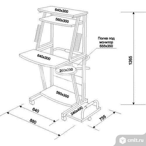 Б.у. состояние хорошее. Продажа в связи с продажей квартиры. Полка под монитор 555 x 350 мм Рабочая поверхность 640 x 300 мм Полка под системный блок 240 x 400 мм Полка под принтер, сканер и т.п. 640 x 300 мм Описание Компактная недорогая компьютерная стойка для дома или офиса Тип установки компьютерной мебели На колесиках; передние колеса имеют фиксаторы Прочие характеристики Страна изготовления товара КИТАЙ Прочее 2 уровня наклона монитора, 2 держателя для CD по 20 ячеек в каждом; средняя полка (под полкой для принтера) 560 x 300 мм, нижняя полка 560 x 300 мм, полка под мышь диаметром 260 мм Совместимость Совместимость Мониторы с диагональю до 19" Логистика Размеры (ширина x высота x глубина) 64 x 127 x 74 см - 84 x 127 x 82 см Размеры упаковки (измерено в НИКСе) 68 x 65 x 11.5 см Вес брутто (измерено в НИКСе) 22.4 кг 12.02.2026 01:29