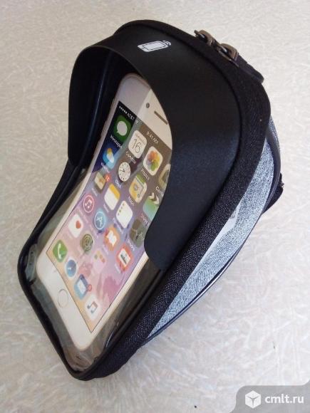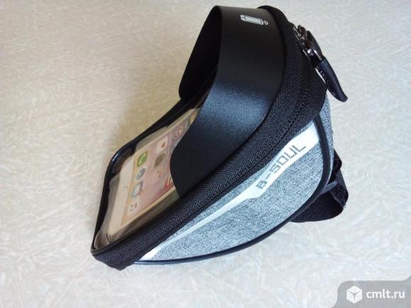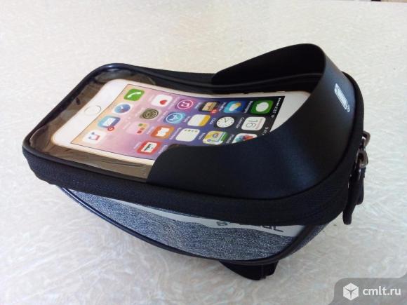 Велосипедная сумка/чехол. Имеет специальный держатель для телефона, который защищает его от падений и вибраций. Крепится к рулю велосипеда; есть ещё место для других вещей (зарядка, ключи, кошелёк). Изготовлена из прочного водонепроницаемого материала. Цвет серый. Размеры: