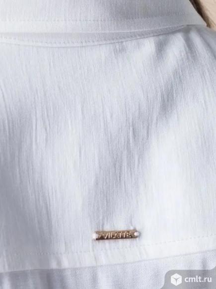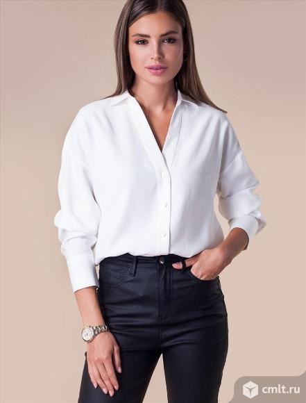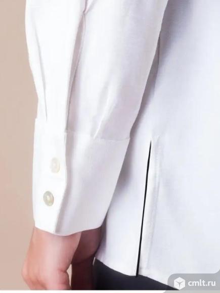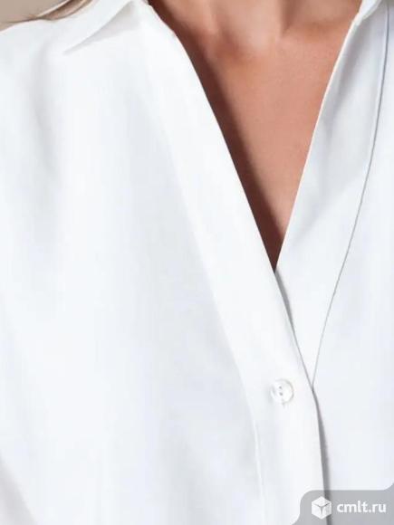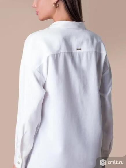 Блузка выполнена из плотной струящейся вискозы полотняного плетения с небольшим эффектом жатки, что делает ткань менее мнущейся и формоустойчивой. V-образная линия борта. Планка с застежкой на пуговицы из натурального перламутра. На спинке изделия расположена металлическая нашившка - логотип бренда. Свободная, летящая блузка - отлично подходит как для деловых образов, так и в качестве накидки в многослойных луках Была одета 1 раз полноценный размер 56-58 отличное состояние