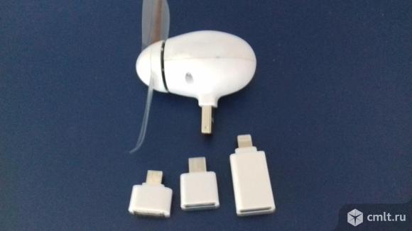 Мини-вентилятор новый (в упаковке) работает от телефона (в комлекте 3 разъёма для разных телефонов, смартфонов, айфонов) и компьютера (для компа нужен шнур с USB - разъёмом)