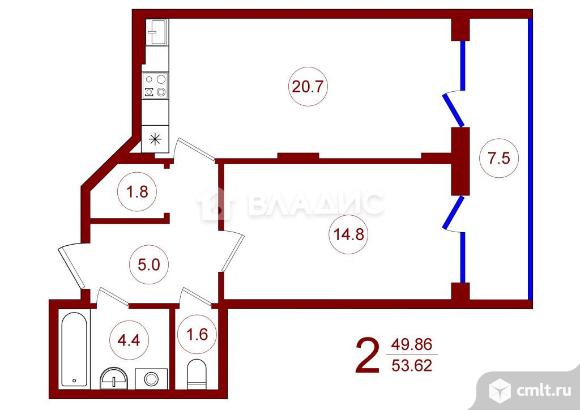 1-комнатная квартира 53,62 кв.м