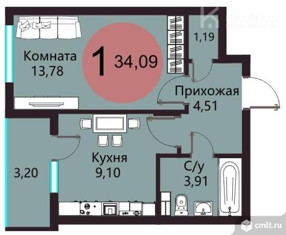 1-комнатная квартира 34,09 кв.м