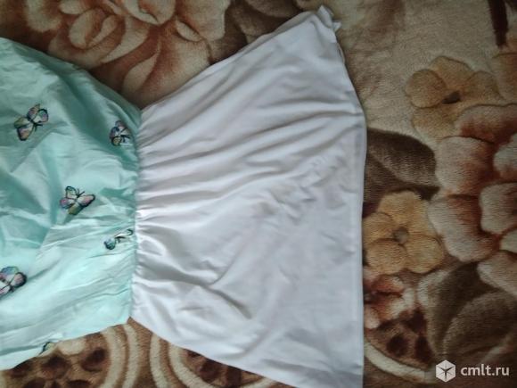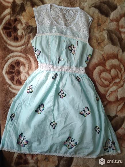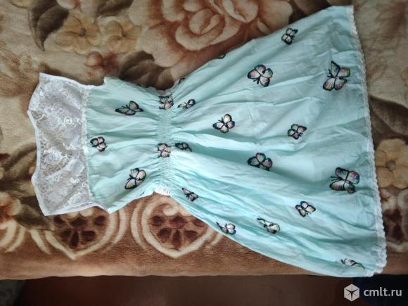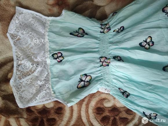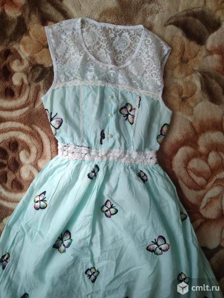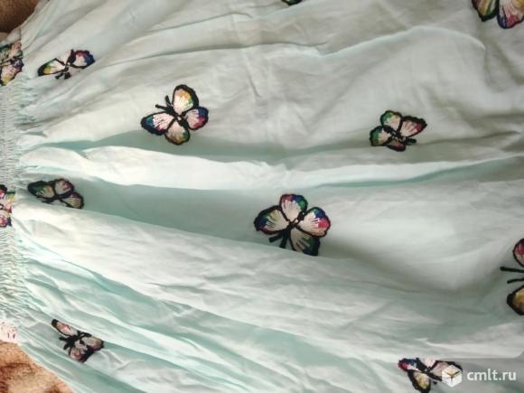 Платье летнее, талия на резинке, к нижней части пришит подклад. Подклад тонкий трикотаж. Верх выполнен из гипюра. Материал основной части хлопок. Платье очень лёгкое, на жару. На ткани вышиты бабочки, цвет голубой.