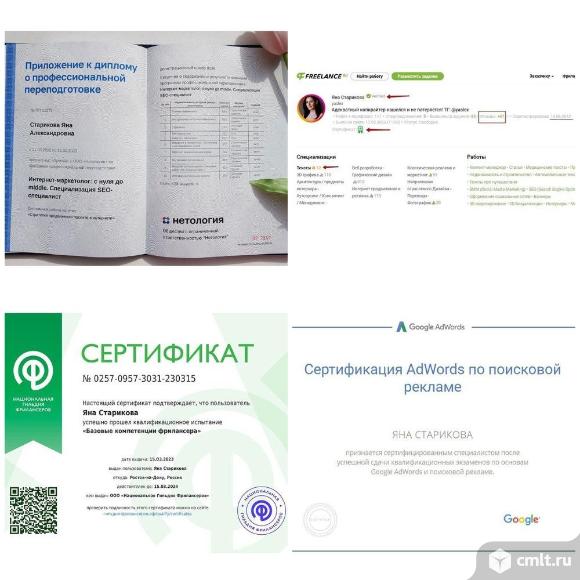 ????Я — Яна Старикова, копирайтер-маркетолог, SEO-специалиcт (диплом), менеджер digital-проектов, практик с 2008 года. Соблюдаю баланс в жизни и текстах. ??Моих клиентов объединяет преданность делу, они одержимы развитием своих проектов больше, чем их конкуренты. Это предприниматели, руководители, владельцы интернет-магазинов. ??Если актуально, пожалуйста, дайте знать. Подготовлю индивидуальный план работы под Ваш бюджет и пожелания. Чeм я мoгу вам помочь: • Личнaя конcультaция (paзбoр, рекомендации, контент-план продвижения сайта, соц. страницы) • Написание постов с публикацией для ВК, ТГ, Дзен (кросспостинг) • Подготовка сценариев для Reels, YouTube (монтаж обсуждается) • Составление экспертных статей для личного сайта или СМИ (обзоры, презентации, e-mail рассылка) • Оформление группы, профиля • Разработка воронки продаж, прототипа для лендинга • Оформление объявлений для контекстной и таргет рекламы • Разработка и создание сайтов-визиток, лендингов на платформе Tilda. ?Самозанятая, работаю по договору по всей России. ?Cпециализируюсь на поисковом продвижении SEO. ?Всегда на связи в будние дни с 9 до 18 по МСК. ?Проверка текстов по сервисам семантики, лексики и уникальности (Text.ru, glvrd, Turgenev). Грамотная вставка ключевых запросов для поисковых систем. ?Качественный материал без “воды“. В подготовку материала входит: составление тезисов, написание, вычитка и редактура. Только потом материал переходит в Ваши руки, вносятся предложение по коррективам (если нужно). ?Baжнo, чтoбы вaш сайт не существовaл, а дейcтвитeльно пpoдавaли. ??Мои гарантии: Вы можете ознакомиться с моими работами и узнать подробнее о каждой услуге перед началом сотрудничества. Опыт подтверждаю широким портфолио, есть рейтинги и отзывы на профессиональных платформах + личный сайт. Предлагаю полный спектр услуг копирайтинга: от анализа конкурентов, написания текстов до публикации контента.