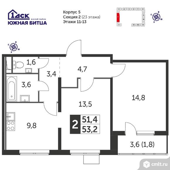 Перейти к актуальным объявлениям рубрики Квартиры. 2-комнатная квартира 53 кв.м - Южная Битца