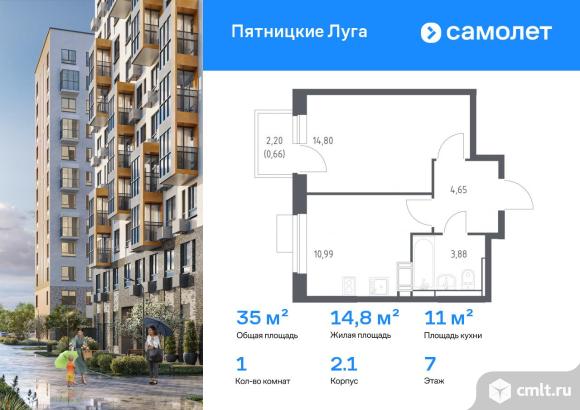 Предлагается 1-комнатная квартира комфорт-класса 34,98 кв.м в корпусе 2.1 на 7 этаже, в ЖК «Пятницкие Луга»