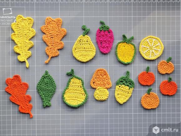 Вязаные аппликации на плодово-осеннюю тематику. Прекрасно подойдут для скрапбукинга, книжек развивашек, миниатюры и аппликации на одежду и аксессуары. Продаются набором.