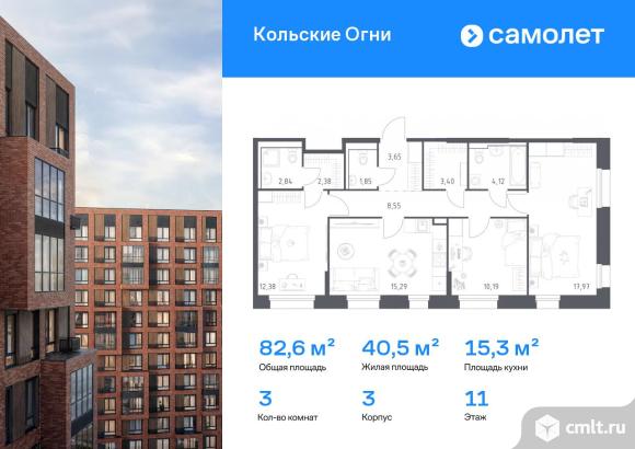 Предлагается 3-комнатная квартира комфорт-класса 82,62 кв.м в корпусе 3 на 11 этаже, в ЖК «Кольские Огни»
