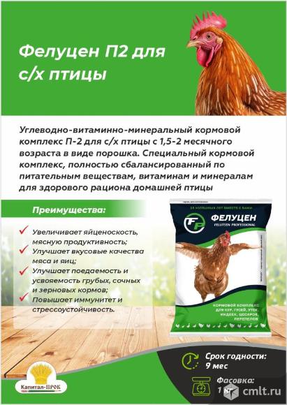 Представляем вам углеводно-витаминно-минеральный кормовой комплекс Фелуцен П2 для сельскохозяйственной птицы! Этот специально разработанный кормовой продукт в виде порошка идеально подходит для птицы с 1,5-2 месячного возраста. Преимущества Фелуцен П2: • Увеличение яйценоскости и мясной продуктивности: Ваши птицы будут не только здоровыми, но и высокопродуктивными! • Улучшение вкусовых качеств мяса и яиц: Наслаждайтесь высоким качеством продукции, которая порадует вас и ваших близких. • Повышение усвояемости кормов: Ваши птицы будут лучше поедать и усваивать грубые, сочные и зерновые корма. • Укрепление иммунитета и стрессоустойчивости: Защитите своих пернатых друзей от болезней и стресса! Состав Фелуцен П2 включает легкоперевариваемые углеводы, макро- и микроэлементы, а также витамины, необходимые для полноценного рациона. Продукт не содержит антибиотиков, ГМО и гормональных препаратов, что гарантирует его безопасность для ваших птиц. Как использовать: Перед утренним кормлением тщательно смешайте Фелуцен П2 с зерном, крупой, кашей или вареным картофелем по указанным в инструкции нормам. Срок годности продукта - 9 месяцев при соблюдении условий хранения. Комплекс упакован в герметичные пакеты по 1 кг. Дайте вашей птице все необходимое для здоровья и продуктивности с углеводно-витаминно-минеральным кормовым комплексом Фелуцен П2! Закажите уже сегодня и убедитесь в результатах!
