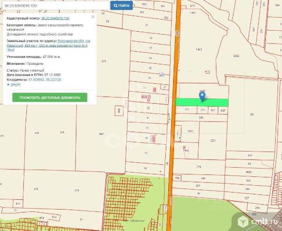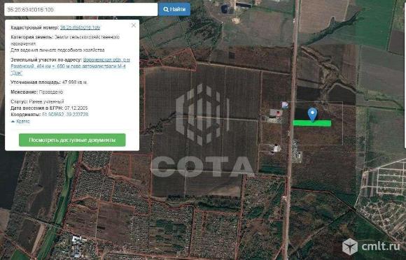 Земельный участок, сельскохозяйственного назначения Площадь 47 998.00 кв.м. Адрес: Рамонский р-н, тер 484 км +, тер 600 м лево автомагистрали М-4 "Дон" Кадастровый номер 36:25:6945016:109 . Земли сельскохозяйственного назначения Для ведения личного подсобного хозяйства