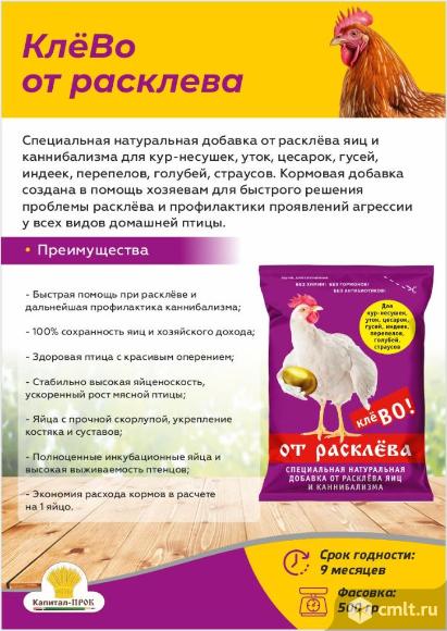 Предотвратите расклев и каннибализм с нашей натуральной добавкой «Клево от расклева»! Если ваши курицы, утки, цесарки, гуси, индейки, перепела, голуби или страусы страдают от расклева яиц или агрессивного поведения, УВМКК Фелуцен П2 станет вашим верным союзником! Эта специальная кормовая добавка создана для быстрого решения проблем и профилактики агрессии у всех видов домашней птицы. Преимущества использования УВМКК Фелуцен П2 (Клево от расклева): • Быстрая помощь при расклеве и надежная профилактика каннибализма! • 100% сохранность яиц и стабильный доход для вашего хозяйства. • Здоровая птица с красивым оперением и стабильная высокая яйценоскость. • Ускоренный рост мясной птицы и яйца с прочной скорлупой. • Укрепление костяка и суставов для активной и продуктивной жизни. • Полноценные инкубационные яйца и высокая выживаемость птенцов. • Экономия расхода кормов в расчете на 1 яйцо. Состав, на который можно положиться: • Легкоферментируемые углеводы, растительный жир, растительный протеин, аминокислоты (метионин, лизин). • Макроэлементы: кальций, фосфор, натрий. • Витамины: A, E, K3, B1, B2, B5, H, C. Натуральный и безопасный продукт: Данный продукт изготовлен из натуральных природных компонентов. Он не содержит антибиотиков, пальмового масла, гормональных препаратов и ГМО. Побочных явлений и осложнений при применении продукта выявлено не было, противопоказаний не установлено. После применения продукта мясо и яйца птицы используются без ограничений. Упаковка: 500 г в герметично завариваемых пакетах из многослойной полимерной пленки. Срок годности – 9 месяцев при соблюдении условий хранения. Позаботьтесь о здоровье ваших птиц уже сегодня! Добавьте УВМКК Фелуцен П2 в рацион пернатых и обеспечьте им здоровье и продуктивность! 26.01.2026 12:10