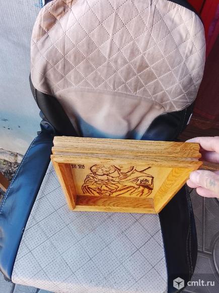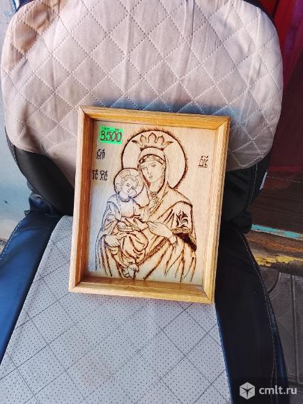 Продам икону ручной работы, выжженная, освещённая, Божией матери с младенцем. Оклад дубовый,без гвоздей и стекла.