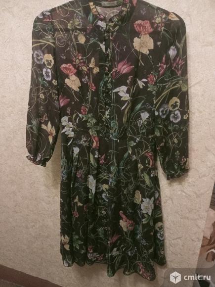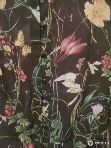 Платье летнее женское на шоколадном фоне цветы и бабочки. Объем груди - 44 см, обхват талии - 70 см, рост - 175 см, длина платья - 105 см. Слева от талии до подмышки - замок, юбка на складках, коричневая нижняя юбка. Цена 550 руб.