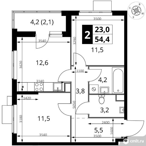 2-комнатная квартира 54,4 кв.м