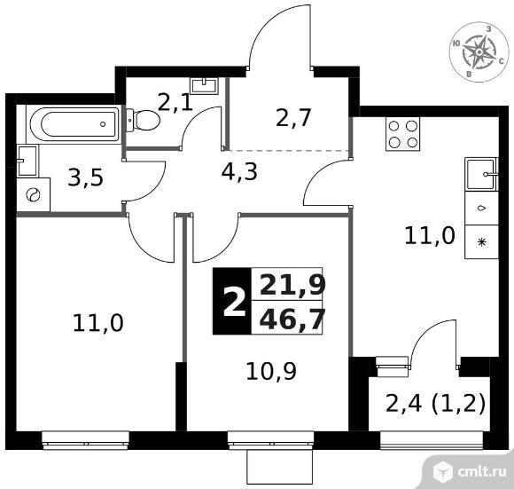 2-комнатная квартира 46,7 кв.м