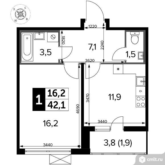 1-комнатная квартира 42,1 кв.м