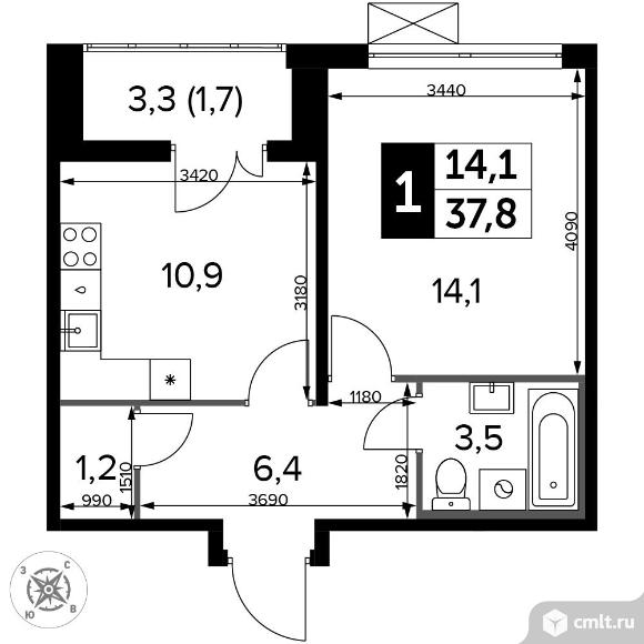 1-комнатная квартира 37,8 кв.м