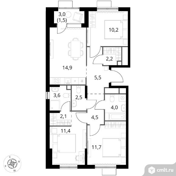 3-комнатная квартира 74,1 кв.м