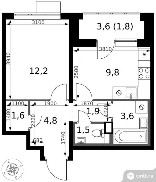 1-комнатная квартира 37,2 кв.м