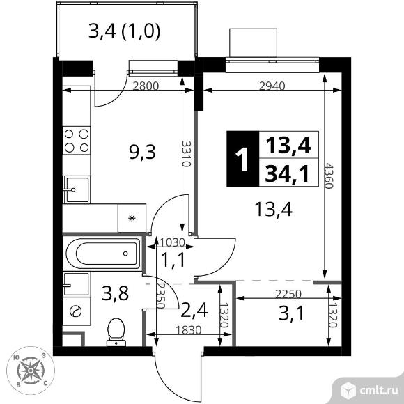 1-комнатная квартира 34,1 кв.м