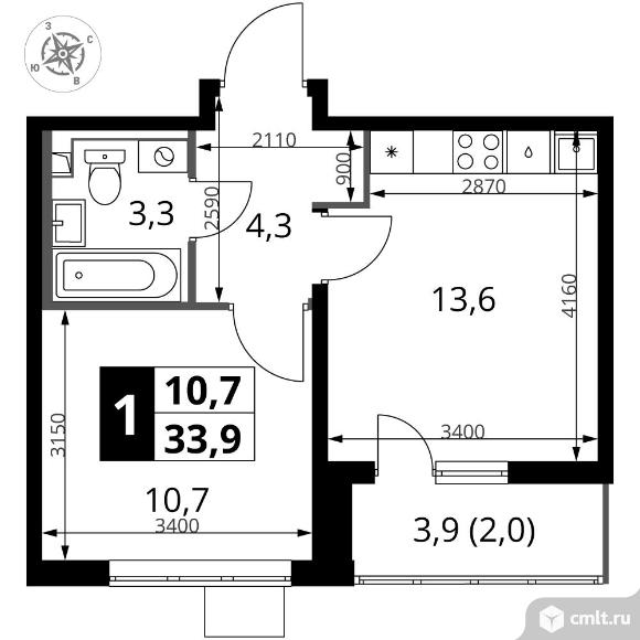 1-комнатная квартира 33,8 кв.м