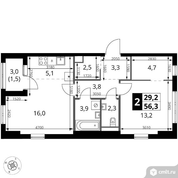 2-комнатная квартира 56,3 кв.м
