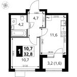 1-комнатная квартира 27,4 кв.м