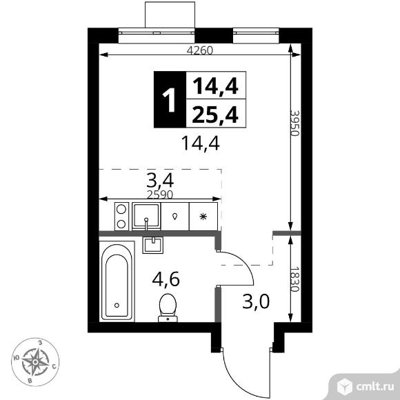 1-комнатная квартира 25,4 кв.м
