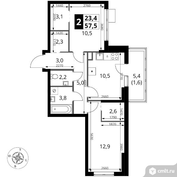 2-комнатная квартира 57,5 кв.м