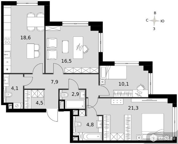 3-комнатная квартира 90,8 кв.м