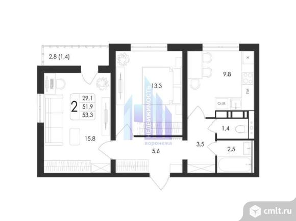 2-комнатная квартира 53,3 кв.м
