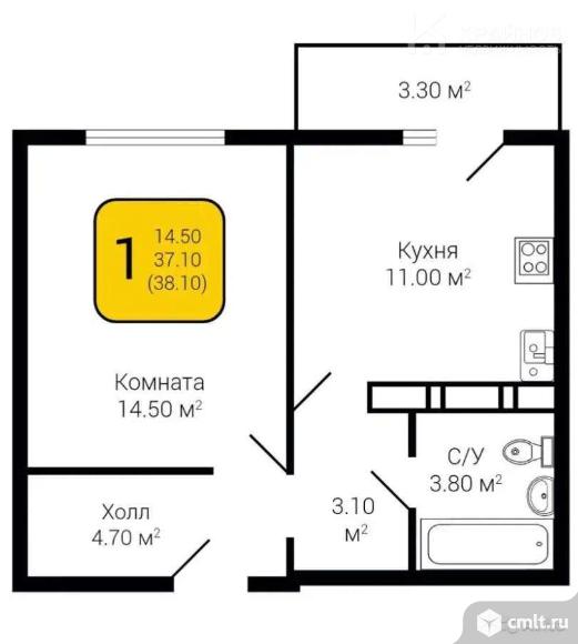 1-комнатная квартира 38,1 кв.м