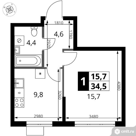1-комнатная квартира 34,5 кв.м