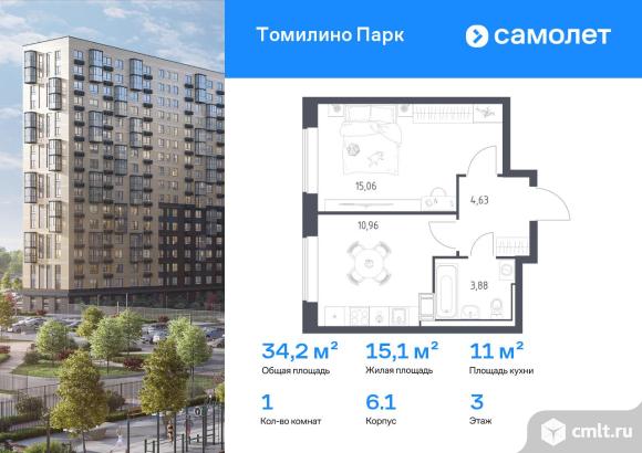 Строим кварталы для жизни с заботой о будущем. Предлагается 1-комнатная квартира комфорт-класса 34,2 кв.м в корпусе 6.1 на 3 этаже, в ЖК «Томилино Парк»