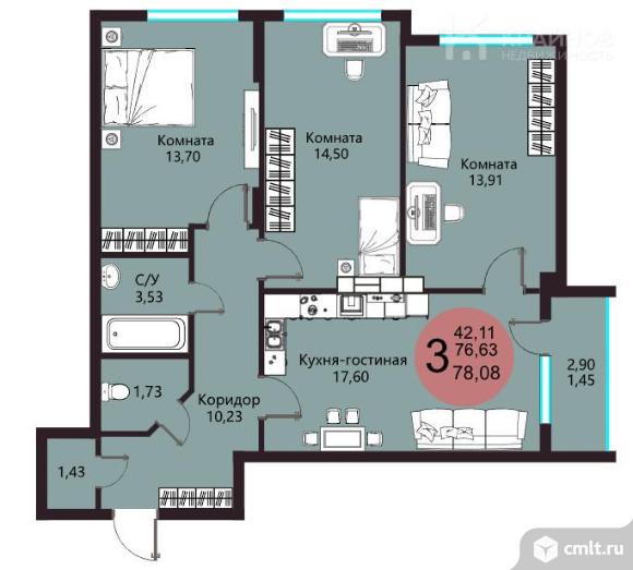 3-комнатная квартира 78,08 кв.м