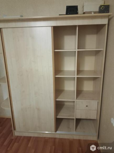 Продаётся вместительный шкаф-купе в хорошем состоянии. Цвет — светло-коричневый. Внутри предусмотрены удобные полки и штанга для одежды. Есть два выдвижных ящика для мелких вещей или косметики. Высота шкафа составляет 220 см, ширина — 170 см, глубина — 57 см. Подойдёт как для спальни, так и для другой комнаты.