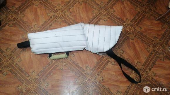 качественная очень плотная ткань, внутри пластины из мягкого пластика. собака будет в восторге. закрывает плечо и удобно сидит на руке, перекрывает кисть на 10 см. отправка по рф без проблем. пишите, договоримся.