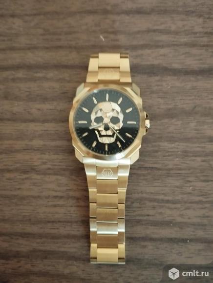 Продаю новые мужские кварцевые часы Philipp Plein pwlaa0822. Центральные часовая и минутная стрелки. Черный циферблат с фирменным изображением черепа золотистого цвета. Круглый корпус выполнен из нержавеющей стали с IP покрытием цвета желтого золота. Диаметр корпуса составляет 40 мм, толщина 8 мм. Заводная головка с защитой. Стальной браслет с покрытием шириной 26 мм, раскладывающаяся застежка. Прочное минеральное стекло устойчивое к мелким механическим повреждениям. Водостойкость WR 50 (мытье рук, дождь). Часы покупал в Галереи Чижова 2 апреля 2024г.. На гарантии. Гарантия 2 года.Покупал за 43000 рублей. Чек,гарантийный талон,фирменная коробка прилагаются.