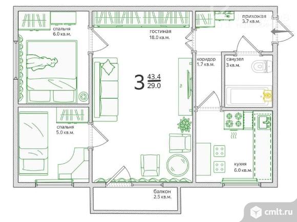 3-комнатная квартира 43,4 кв.м