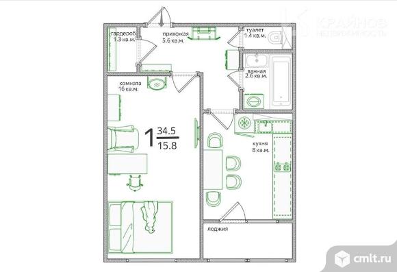1-комнатная квартира 34,5 кв.м