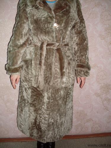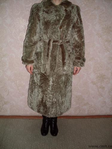 Стриженый мутон, длина - средняя, цвет серо-палевый, размер 46-48, прямая с поясом. Состояние хорошее. торг.