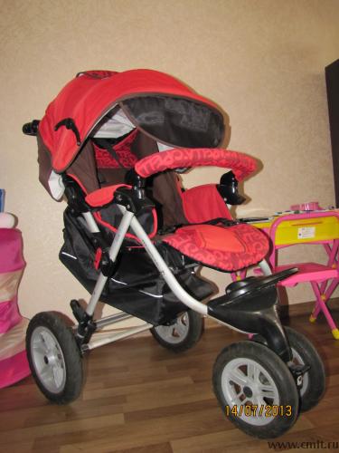 Удобный механизм складывания коляски и возможность стоять в сложенном положении занимает очень мало место в квартире. Сиденье накрыто удобным матрасиком, который можно снять летом, ремни безопасности также снабжены мягкими накладками, сиденье большое по длине и может удлиняться за счет выдвигающейся панельки. Большая, удобная корзина для покупок, при необходимости прижимается к спинке и не прогибается под тяжестью. В комплекте: 2 накидки на ножки (зимняя и демисезонная), насос для подкачки колес. Дополнительно отдам чехлы на колеса. В использовании 1 год, хорошее состояние. 24.07.2013 08:04