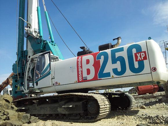 Масса машины 82 т Максимальный диаметр 2500 мм Максимальная глубина 78 м CASAGRANDE В250 ХР является универсальной платформой для установки различных типов фундаментостроительного оборудования (келли штанга, стена в грунте, сваи с вытеснением грунта, смешивание грунта, микропиллинг, джет граутинг и т.д.). Технические характеристики: Стена в грунте Максимальная глубина 35 м Максимальная длина выработки 3000 мм Максимальная ширина выработки 1200 мм Характеристики шасси Ширина со сдвинутыми(трансп. положение)/ выдвинутыми гусеницами 3000 / 4500 мм Длина гусениц 5545 мм Ширина башмаков 900 мм Двигатель DEUTZ AG TCD 2015 V06: 2200 об/мин/330 кВт Главная лебедка Номинальное тяговое усилие на 1-м слое 250 кН Максимальная линейная скорость 90 м/мин Оборудование в рабочем состоянии 11.03.2015 19:06