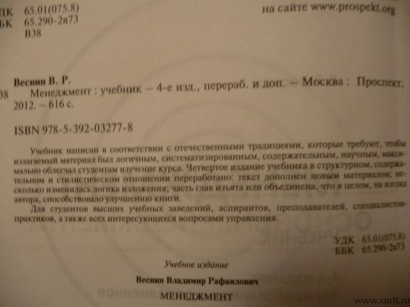 Веснин В. Р. Менеджмент. Учебник. 4-е издание, с изменениями и дополнениями. Москва: Проспект, 2012